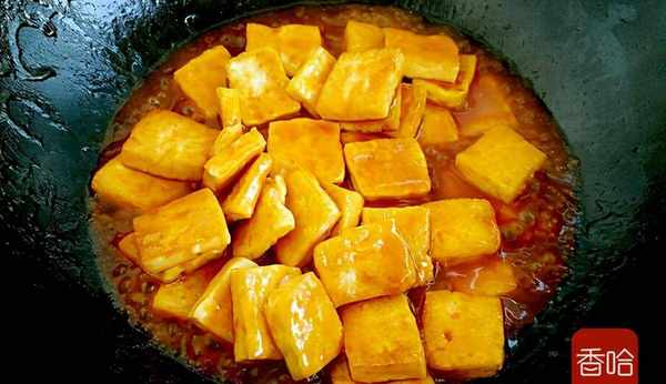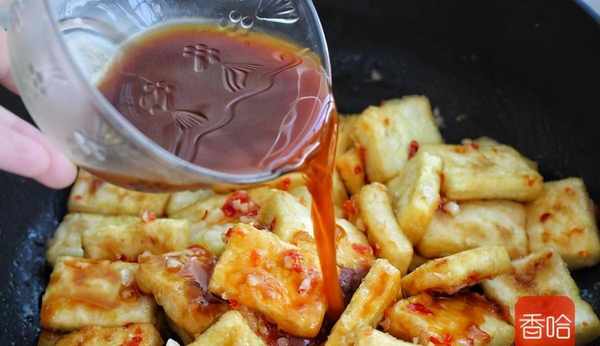 9.接著放入煎好的豆腐翻炒均勻,倒入調好的醬汁。