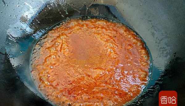 4.另起鍋放少許油燒熱後,倒入調好的醬汁煮成粘稠狀態。
