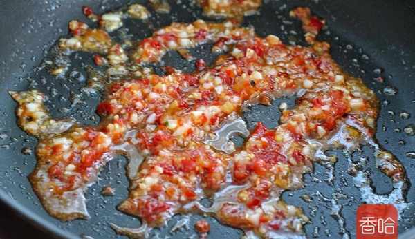 8.就著煎豆腐的鍋中底油放入薑、蒜末小火炒香,再倒入剁椒醬翻炒均勻。