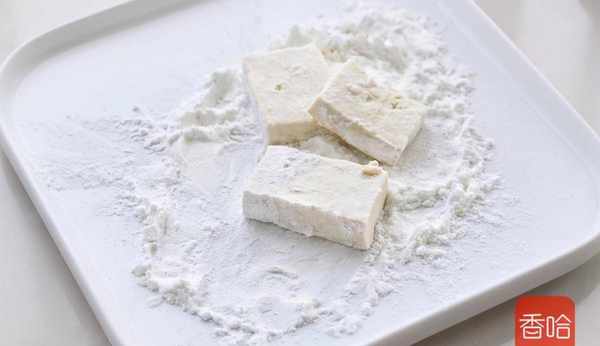 4.將豆腐塊的表面裹上一層薄薄的玉米淀粉。