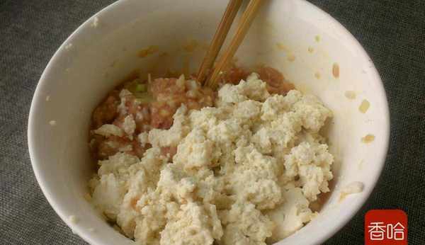 3.把豆腐放肉餡碗裡攪拌均勻