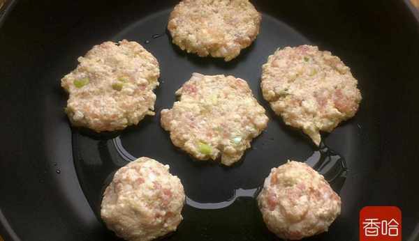 6.平底鍋到適量油,把豆腐肉餡團成球,依次放鍋裡,再輕輕按壓成小圓餅,中小火煎制