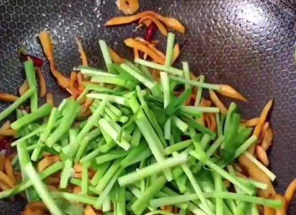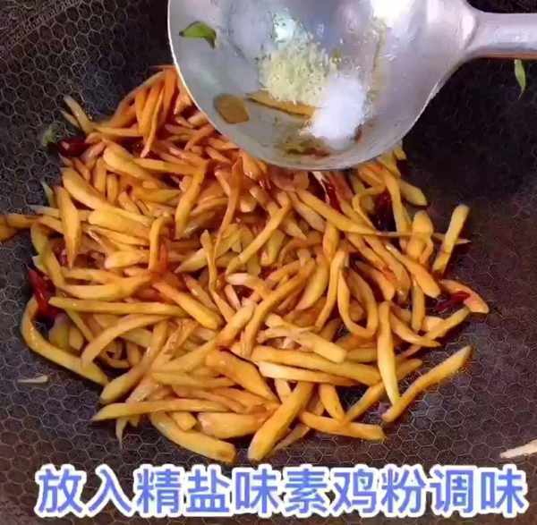 第四步:下入攥幹水份的杏鮑菇,在鍋裡翻炒一會兒,炒至入味,放入精鹽、雞粉調味;