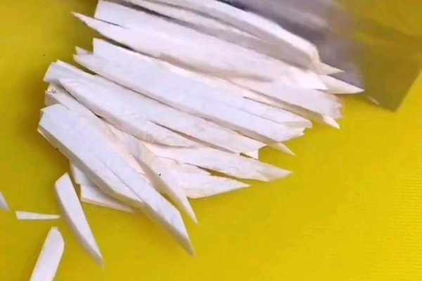 第一步:首先將買回來瞭杏鮑菇洗凈,改刀切成筷子頭粗細的絲。