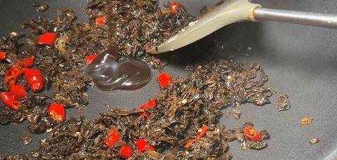 7.不用洗鍋,加入植物油,下入紅辣椒段爆香,接著下入擠幹水分的梅幹菜