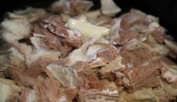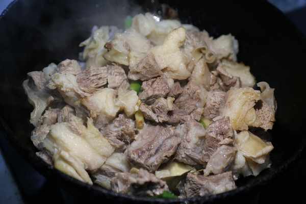 6、 在炒牛肉的同時,另外一個爐灶用砂鍋燒水,水開後,正好牛肉炒好,把炒好的牛肉放入砂鍋中