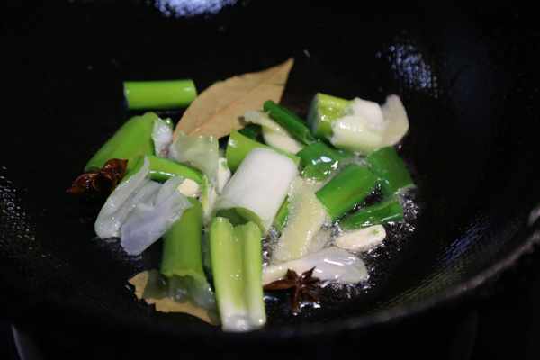 4、 炒鍋中放油,馬上放入白糖,調成中小火,用鏟子不停的攪拌,炒到白糖起泡變色放入蔥、薑、蒜、大料、香葉炒香