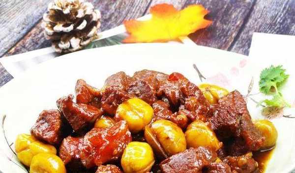 【栗子燒牛肉】【必要食材】牛肉、栗子、蔥、生薑、八角、桂皮、香葉【調味料】生拔、老甜料酒、砂糖、冰糖、蠔油、雞肉精華;步驟一:牛肉洗凈,切成2厘米大小,放入清水中多次浸泡,充分浸泡血液,瀝幹水分。