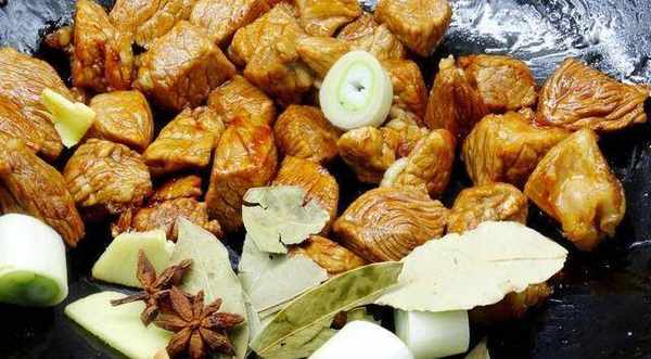 步驟二:在鍋裡燒水,幾片薑片,放入少量料酒,水放入牛肉塊煮3分鐘,撈出水滴做水分備用,栗子用熱水浸泡5分鐘後,去掉殼,去除表面的細皮,步驟3:將鍋放在火上,加入少許冰糖翻炒,使其變成砂糖色,放入牛肉塊翻炒,如果糖的顏色不能炒的話,可以用舊抽屜上色,步驟四:牛肉塊顏色均勻後,加入蔥、薑片、八角、桂皮、香葉炒香。