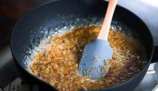 3.平底鍋倒入蜂蜜,倒入上一步的桂花糖,持續小火煮至砂糖融化。