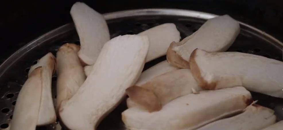 2.將杏鮑菇清洗幹凈後撈出來放在案板上面,用刀將杏鮑菇切成薄厚相當的片,切好以後將其全部放在蒸鍋的蒸屜裡面。起鍋燒水,鍋中加入適量的清水進去,蓋上蒸鍋的蓋子,將鍋中的杏鮑菇片開大火蒸20分鐘的時間。