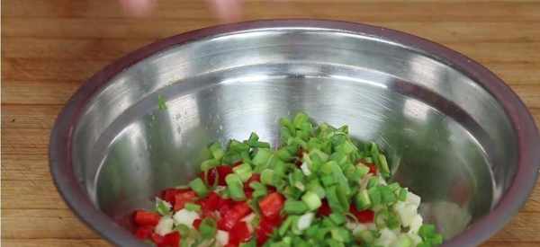 5.拿出適量的大蒜出來,剝掉大蒜的皮,將其切成蒜末放入我們事先準備好的碗中。拿出紅椒出來用清水將其清洗幹凈,將紅椒切成大小均勻的碎丁,切好後放入放有蒜末的碗中。再把我們的蔥拿出來清洗幹凈切成蔥花,切好後一起放進碗中待用。