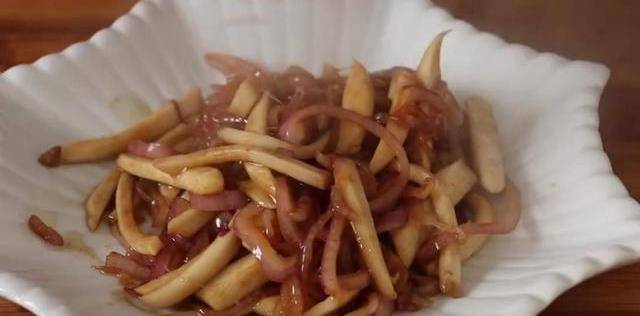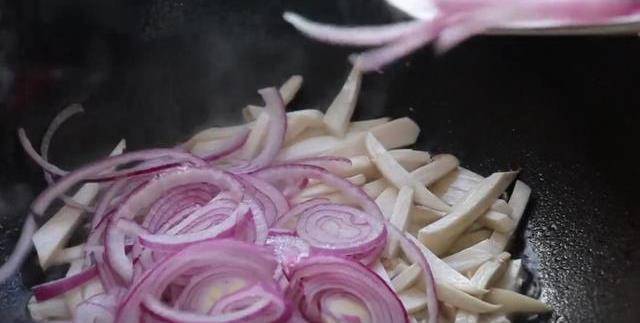 5.另外起鍋燒油,鍋裡面倒入適量的食用油進去,油熱之後把剛才蒸好瞭的杏鮑菇和切好的洋蔥一起倒進鍋裡面去。用鏟子不停地翻炒,將其翻炒均勻,炒出洋蔥的香味出來即可。把杏鮑菇和洋蔥充分地翻炒至融合在一起。