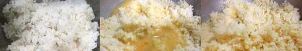 2隔夜飯戴一次性手套捏碎,越碎越好,然後加入雞蛋攪拌均勻