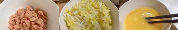 1火腿腸切丁、娃娃菜洗凈切絲、雞蛋打散加一點鹽攪拌均勻
