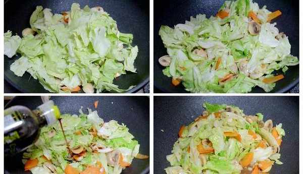 7、放包菜翻炒斷生,加一點醬油,翻炒均勻,菜肴入味即可出鍋裝盤。