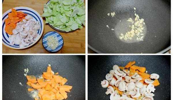 6、炒鍋上火燒熱,放玉米油,放大蒜炒香,放胡蘿卜片翻炒斷生,再放口蘑片翻炒斷生;