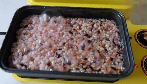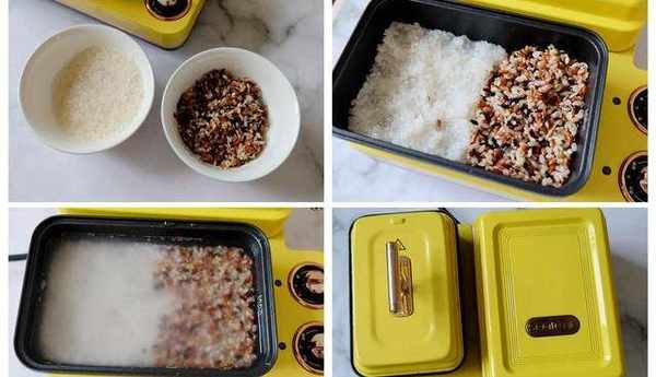 1、先來看米飯,小半碗三色糙米提前浸泡30分鐘,再取小半碗大米,分別洗凈,一起放在多功能早餐機的小方盒裡,各占一半的地方,倒入清水,蓋上鍋蓋,選“煎烤”功能煮開;