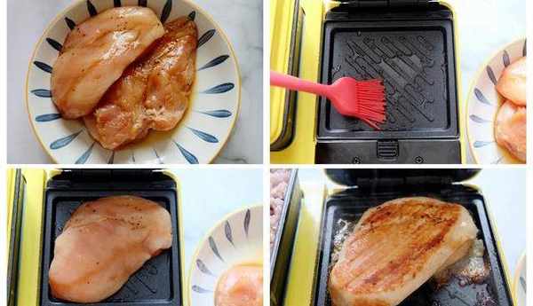 3、雞胸肉兩塊,用料酒、生抽醬油、鹽、黑胡椒碎拌均勻,提前醃上,我一般是醃三小時以上,方便雞胸肉入味。多功能早餐機換上三明治盤,上下盤都刷油,把醃好的雞胸肉放進去,合上蓋子,煎烤8分鐘左右;