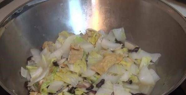 等到香菇的香味越來越濃的時候,把切好的大白菜倒進鍋裡並加入一些鹽繼續翻炒,然後倒入少量的水,然後蓋上鍋蓋燜上3分鐘。