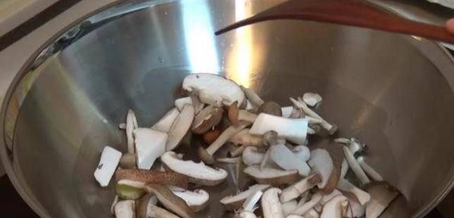 鍋裡倒入油,油燒到七八成熱的時候,把香菇倒進去翻炒。