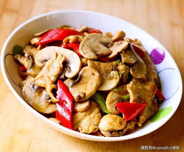 熱鍋涼油倒入肉片滑炒,炒到變色盛出。然後加入蒜末、口蘑翻炒,炒到微微變軟,再倒入紅椒翻炒。