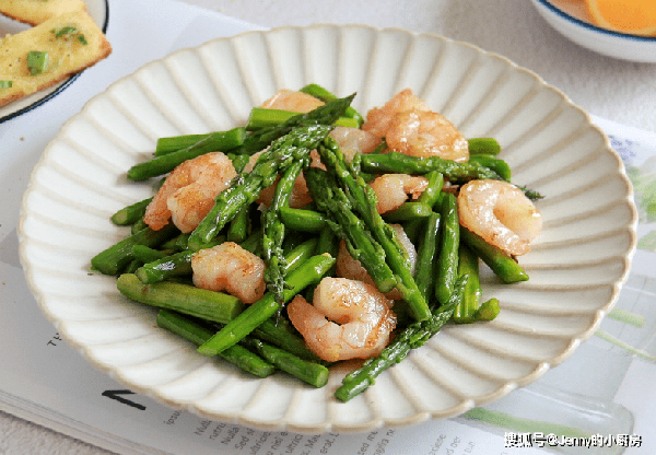 另起鍋加油,燒熱後放入蒜片爆香,再倒入蝦仁、蘆筍翻炒。