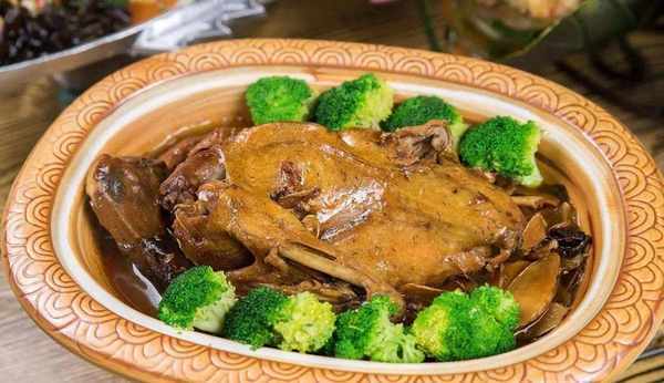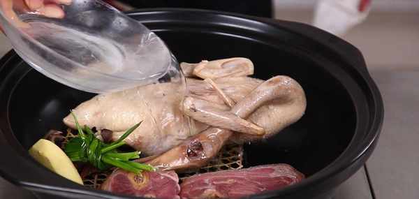 4、要註意,鴨子擺放的時候,鴨胸要朝下。用紗佈把這些材料捆紮好,放入瓷盆內。接著,在瓷盆中,加入紹酒、薑蔥、鹽、醬油、胡椒粉和鮮湯。盆口用一張打濕的白紙封上。將瓷盆放入蒸籠之中,蒸3個小時左右的時間。