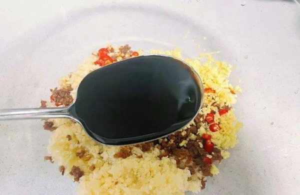 7. 準備一個大碗,放入切好的蒜米,小米辣,薑碎,檸檬汁,醃檸檬碎,然後加入4勺生抽。