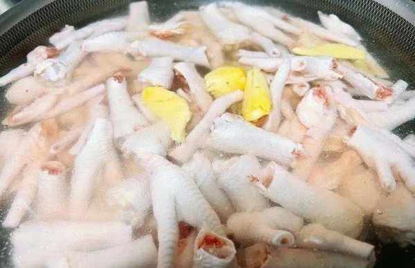 4. 雞爪冷水下鍋,放入薑片,料酒。