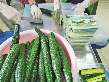 5月2日清晨,1300餘斤現摘的新鮮黃瓜被運送到曲堤黃瓜市場,經過工作人員的清洗、切分、包裝等環節後,來到淄博燒烤現場。志願者們一邊宣傳曲堤黃瓜,一邊請遊客試吃,並送出包裝好的黃瓜,獲得瞭遊客們一致好評。