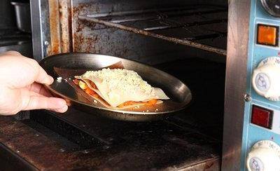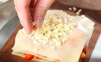 撒上帕瑪森起士粉,再蓋上一層面皮,鋪上餡料、撒上起士粉,如此重復,共三層餡料,最上層再蓋上一層面皮、撒上起士粉。