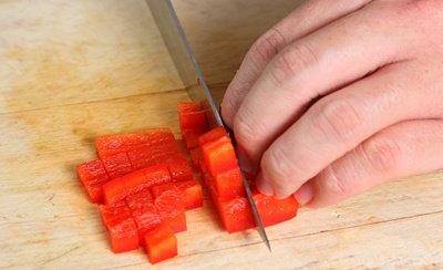 紅蘿卜和荸薺削皮、切丁,紅、黃椒各切丁,蘑菇切片、番茄切丁備用