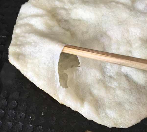餅薄,就是搟餅皮的時候,一定要搟薄,越薄越容易鼓泡。