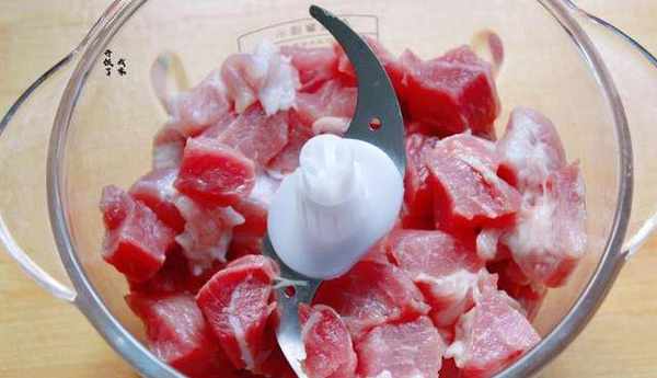 2.我買的是前腿肉,切成小塊放料理機裡攪拌成肉餡。