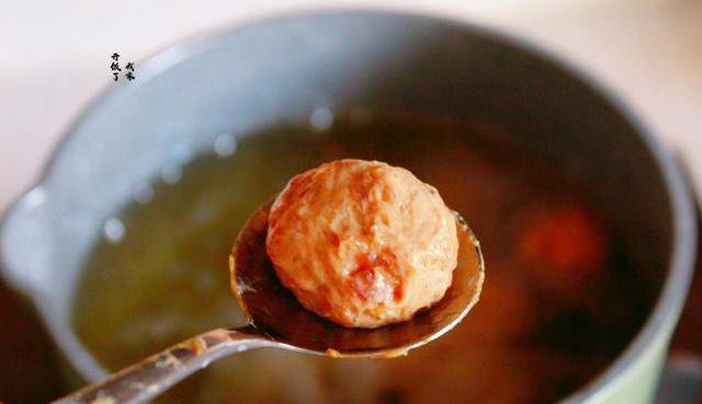 9.肉餡調好後就可以炸肉丸瞭,油溫很重要,第一次炸肉丸要用中火將油燒熱,因為中途不能減小火苗,以免吃油。油溫燒到6成熱的時候,就可依次放入肉丸子,每放一個肉丸子,就將勺子在油鍋裡沾一下,防止粘連。