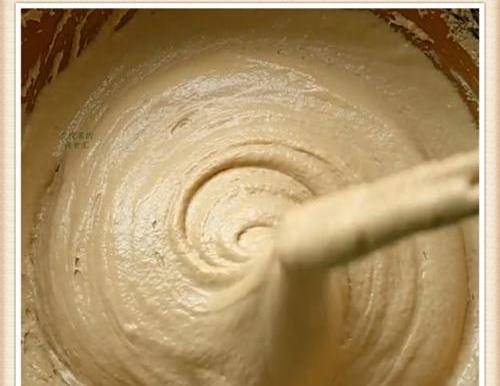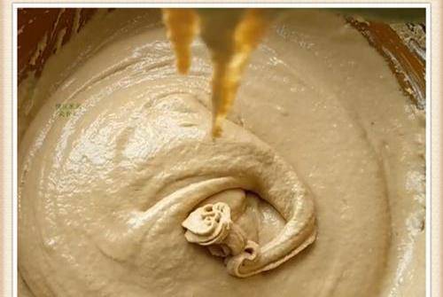 邊倒邊攪拌,用筷子攪成細膩黏稠稍微幹一點的面糊,註意面糊一定不要調得太稀瞭,如果太稀的話,發糕的中間會發粘夾生,