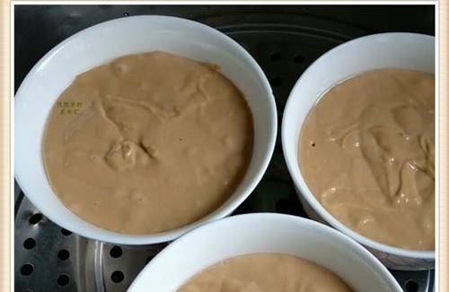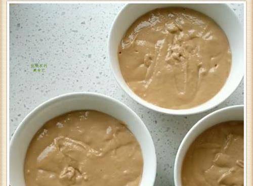 【第三步】:另外準備三個幹凈無水的小碗,用刷子沾上食用油在碗的底部和側面都刷上食用油,這樣子起到防粘連的作用,使發糕做好之後更加容易脫模,當然也可以用一次性的紙杯來做,方法也是一樣的,接下來把面糊均勻的倒入三個碗裡面,註意隻要倒八分滿就可以瞭,