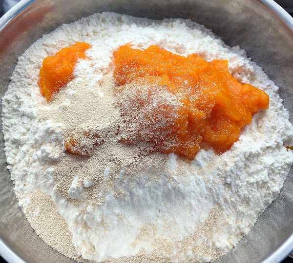 1.面粉中加入低於30度的南瓜泥、糖和酵母拌成棉絮狀(如果太幹可以略微加入一點清水)。