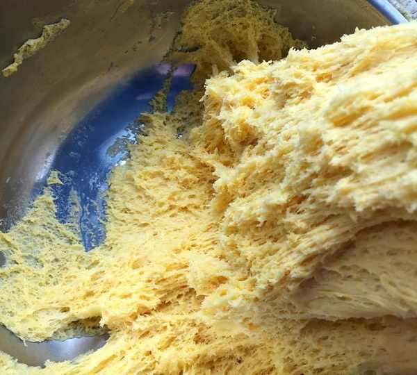 3.發酵好的面團拉開裡面有蜂窩狀就說明發酵成功瞭。