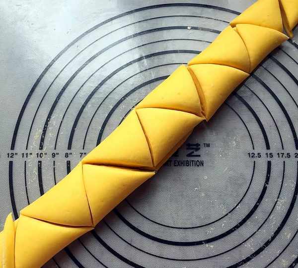 4.盆中取出面團放在案板上揉出氣泡,排氣後先揉圓再搟成薄厚均勻的大面片,表面塗一層油從一邊卷起切成v型的三角。