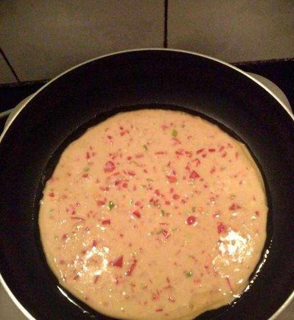 6.直線倒入面糊凝固翻面再煎三分鐘就可以吃瞭。