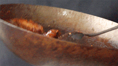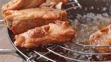 3、醃好的排骨下160度的蒜油鍋,中火慢炸5分鐘左右,炸至完全變色時,撈出;待油燒至180度時,回鍋大火復炸3分鐘,撈出瀝油。