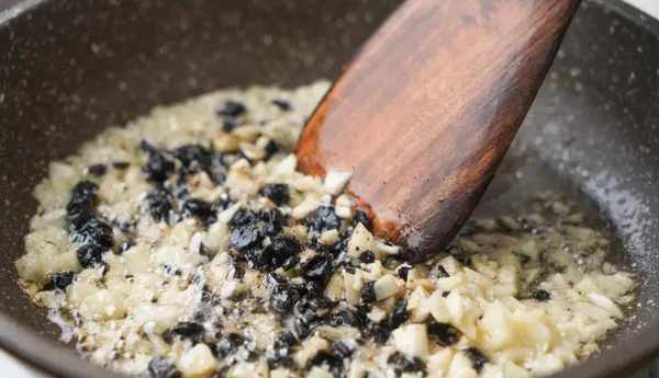 5、3g豆豉用刀拍扁切碎,5瓣大蒜剁碎,用適量花生油將蒜蓉炒出香氣,加入豆豉翻炒幾下,盛出備用。