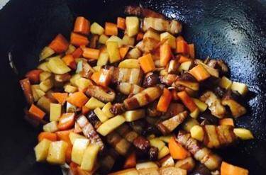 【制作配料】:五花肉、土豆、大米、馬蹄、胡蘿卜、八角、桂皮、大蔥、黃酒、黃醬、老抽、生抽、耗油、腐乳汁、冰糖、油鹽