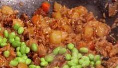 打開鍋蓋,等湯汁完全吸入米飯後,加入適量提前炒熟的青豆,調至大火,均勻翻炒後燜20秒鐘。這道簡單又美味的鹵肉飯就完成啦。