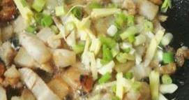 炒鍋裡加些許底油,放入2個八角和少量桂皮,用小火煸炒出香味,接著放入蔥段和五花肉一起煸炒。