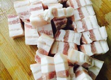 五花肉切成中等大小的肉丁,大蔥切成小段,同時準備一些八角和桂皮。