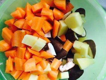 土豆、馬蹄、胡蘿卜洗凈後切成小塊,泡在清水裡去除表面多餘的淀粉。將大米淘洗幹凈後備用。