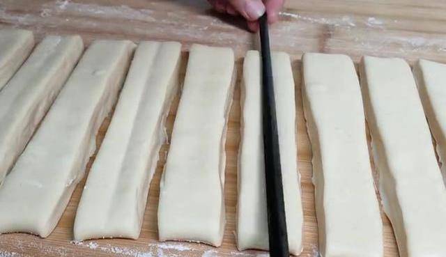 面醒好後不用揉,直接用手搓成長條。表面撒上一層幹面粉,用搟面杖搟薄,用刀切成兩厘米寬的長條,全部切完之後,用筷子隔一條在上面加上清水,兩邊對折疊在一起,筷子輕輕從中間按壓一下。然後從中間對半切開。兩端用手捏合一下,這樣在炸的過程中不容易散開。